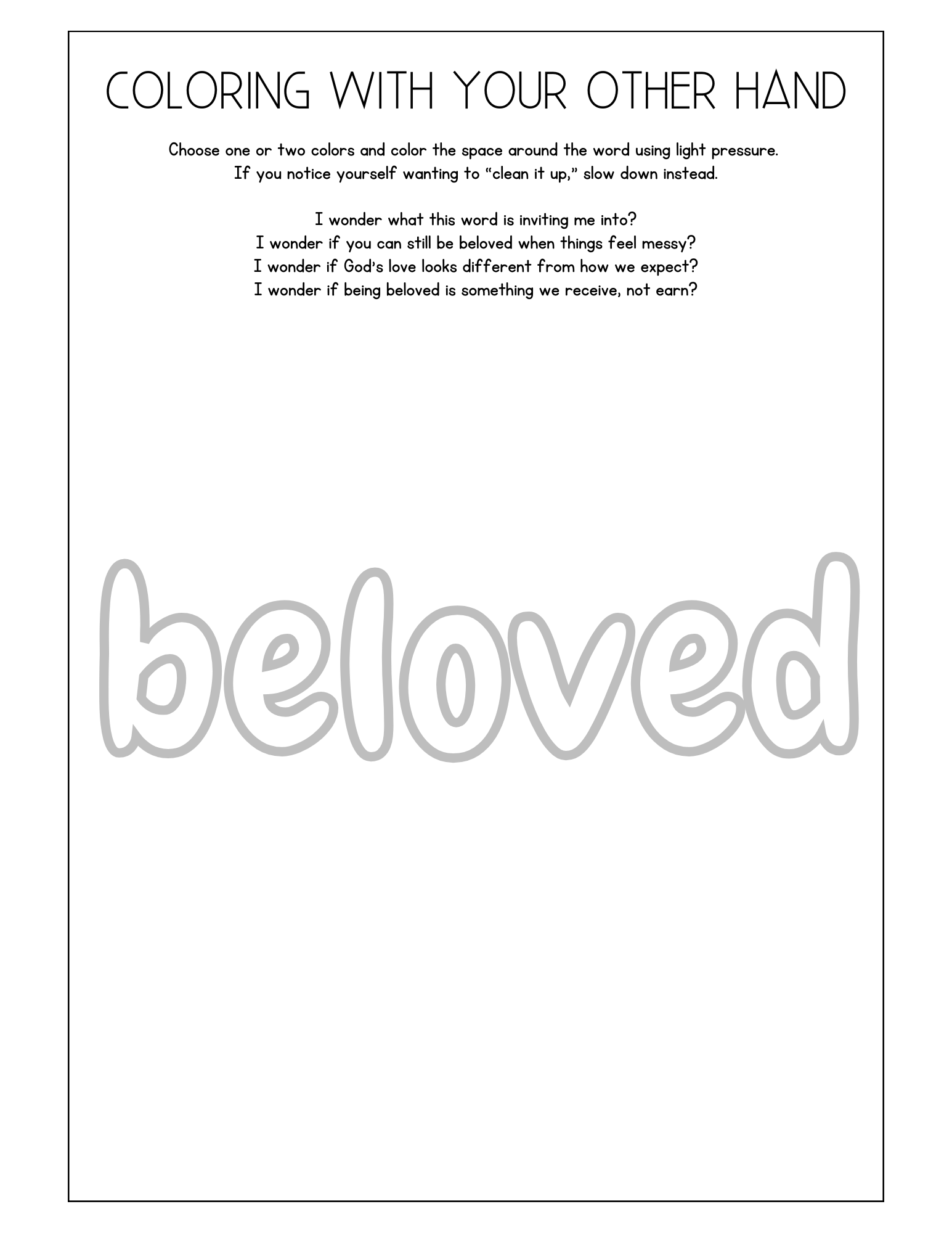Write the word with your non-dominant hand, or use this coloring page and the word “beloved”.