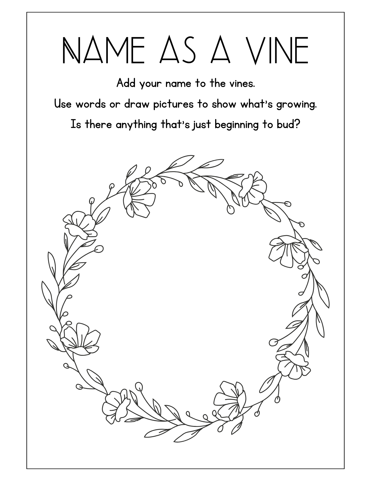 Imagine writing your name and letting it grow, like branches, vines, or roots. Does it look strong and sturdy, or light and twisty? Is it full of leaves, flowers, or fruit? Or maybe it’s resting for a season, waiting for new growth.