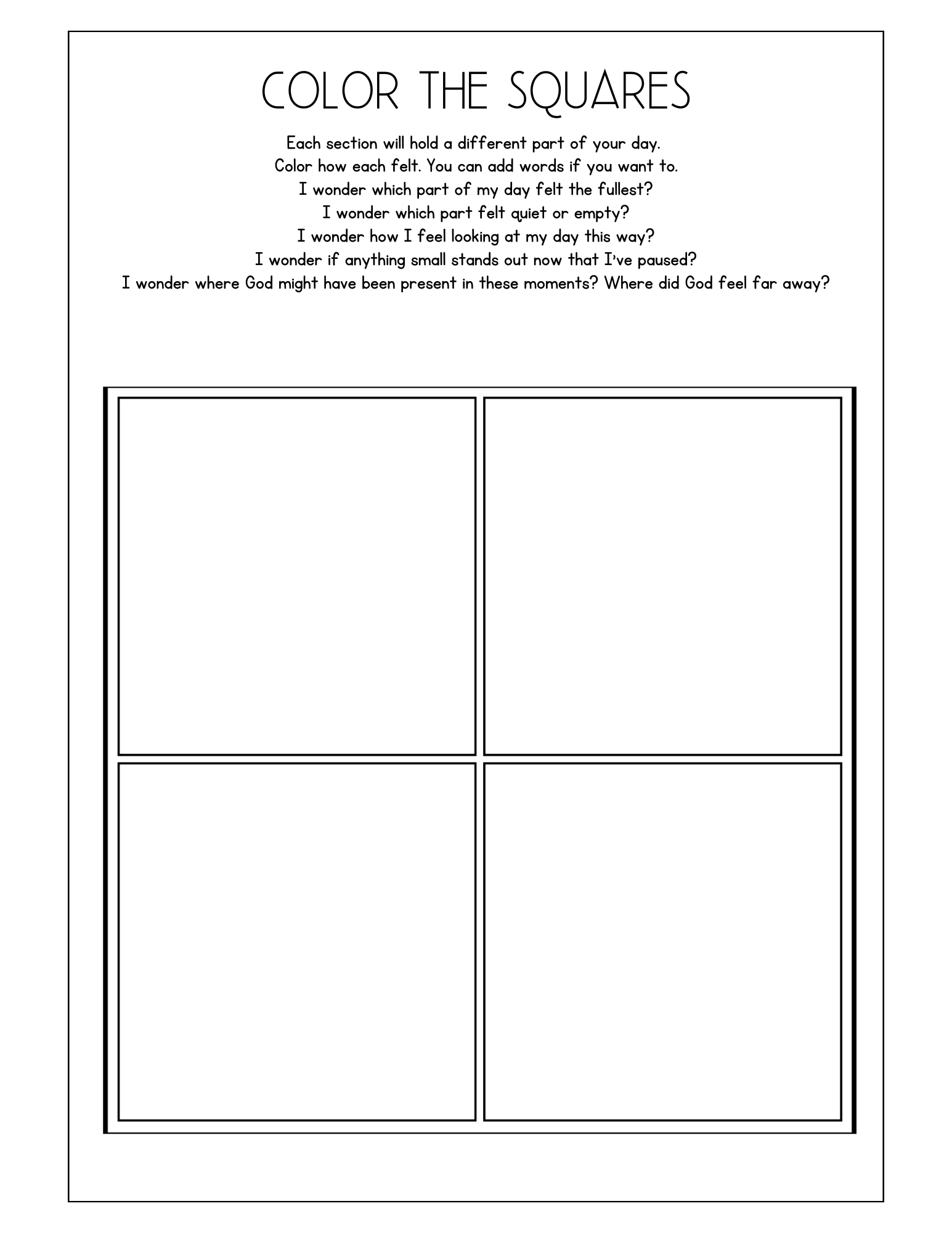 Draw a square on your page, or use this coloring page. Divide it into four sections. Each section will hold a different part of your day. You might choose: